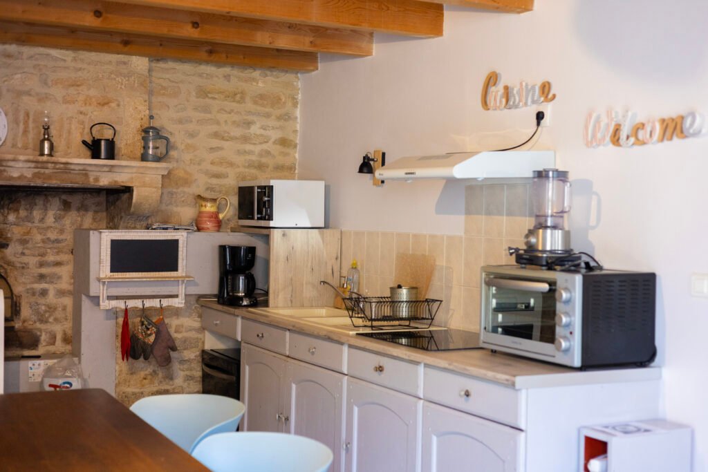 Elle comprend tout le nécessaire pour cuisiner en toute sérénité : four, plaque de cuisson, lave-vaisselle, micro-ondes, cafetière, bouilloire et grille-pain. De quoi partager de bons repas et profiter pleinement de votre séjour.