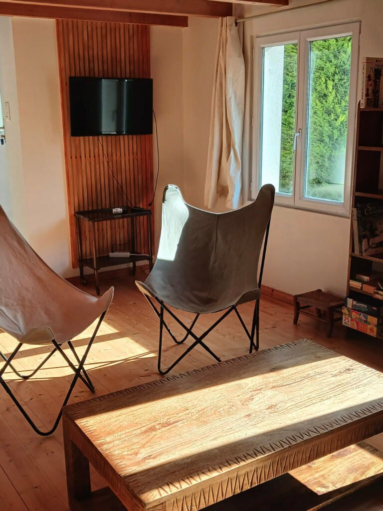Vous y trouverez un canapé, un clic-clac et des fauteuils confortables, ainsi qu’une télévision et le WIFI pour rester connecté si vous le souhaitez. Une bibliothèque et des jeux sont également à disposition pour prolonger les soirées en toute simplicité.